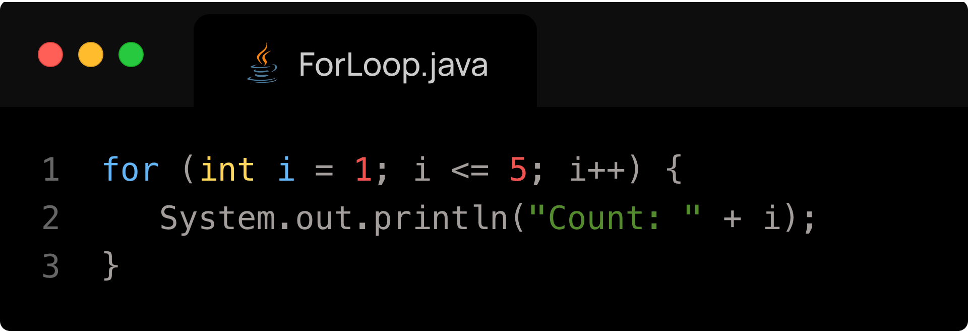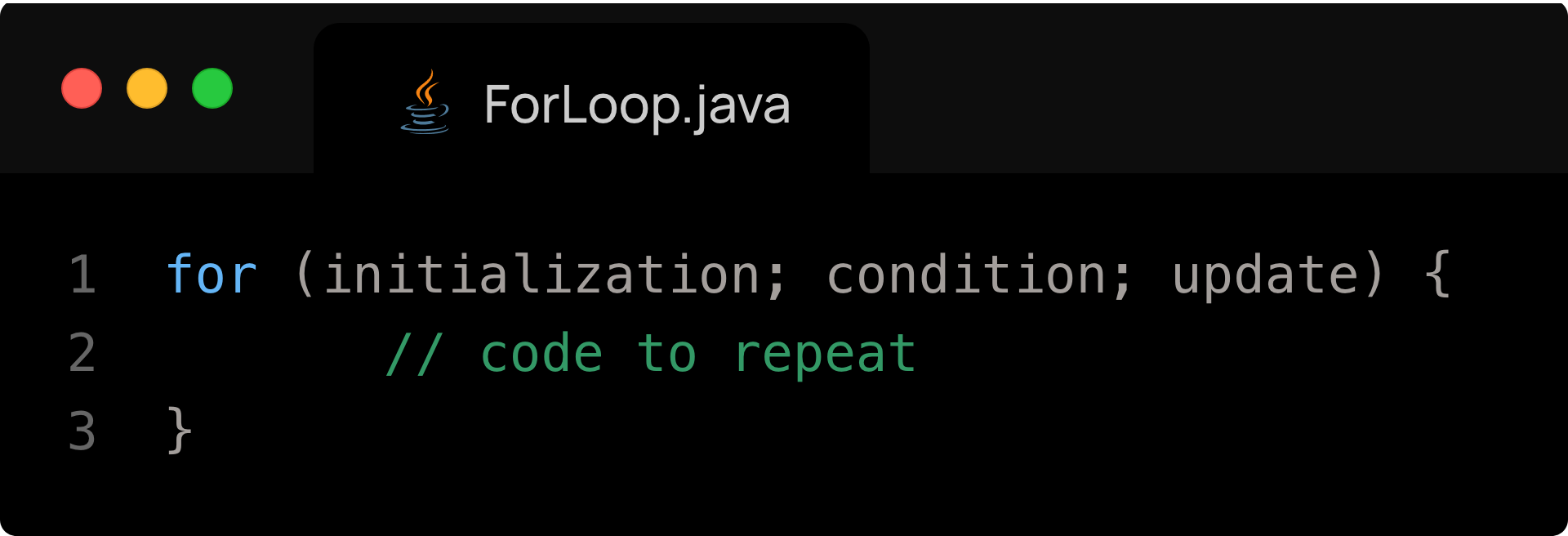 - Initialization: runs once at the start (e.g., int i = 0)