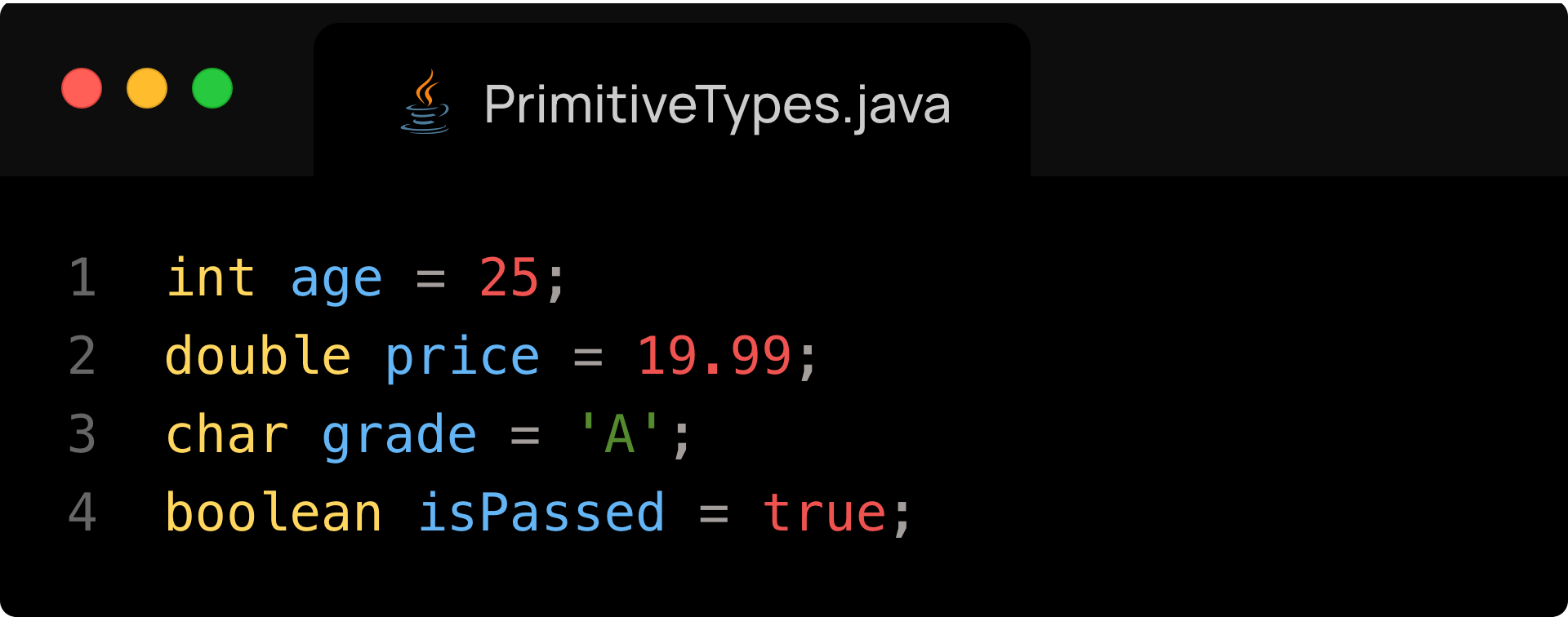 In Java, primitive types are the most basic data types and are not objects. They store simple values directly in memory. Java has eight primitive data types [Oracle] Primitive Data Types - Java Tutorials: